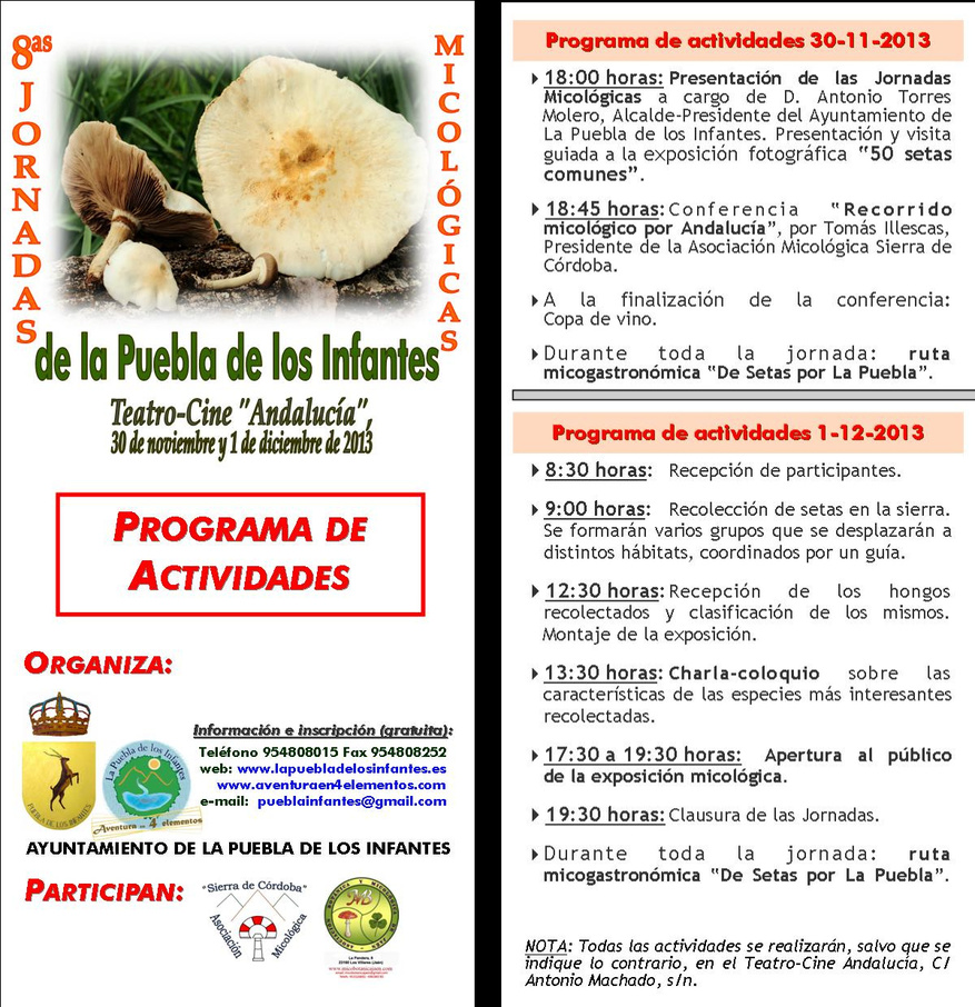 8ª JORNADAS MICOLOGICAS DE LA PUEBLA DE LOS INFANTES, SIERRA NORTE DE SEVILLA.Como viene siendo habitual, por Otoño llegado los fríos, se organiza en nuestra localidad las jornadas micologicas que ya este año cumple su 8ª edición. Son unas jornadas muy interesantes por su atractivos paseos, buscando setas, por los senderos marcados y señalados por la organización para ello.Tiene muchas afluencia de publico y son muy visitadas por grupos familiares y amigos de nuestros pueblos de alrededor. Son una buena ocasión, para pasar en familia, un buen fin de semana, disfrutar de la naturaleza y paisajes, y como no, de nuestra gastronomía. Anímate y envía tu inscripción al ayuntamiento de La Puebla de los Infantes, "veras como repites en la próxima edición."